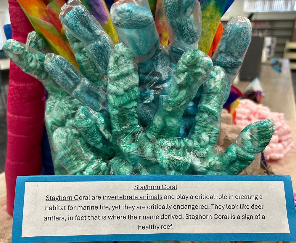 All their efforts culminated in a vibrant coral reef art installation in the school’s media center. The reef (pictured below) is made entirely from reclaimed materials to visually communicate a vital message: we can protect our oceans by rethinking how we use and dispose of plastics.