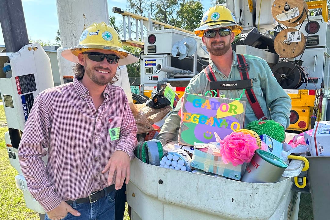 Eastern Service Area Lineworker Justin Pettys and Apprentice Dalton Katrein looked forward to bringing smiles to students’ faces during their efforts to “break some eggs” at Alafia Elementary.