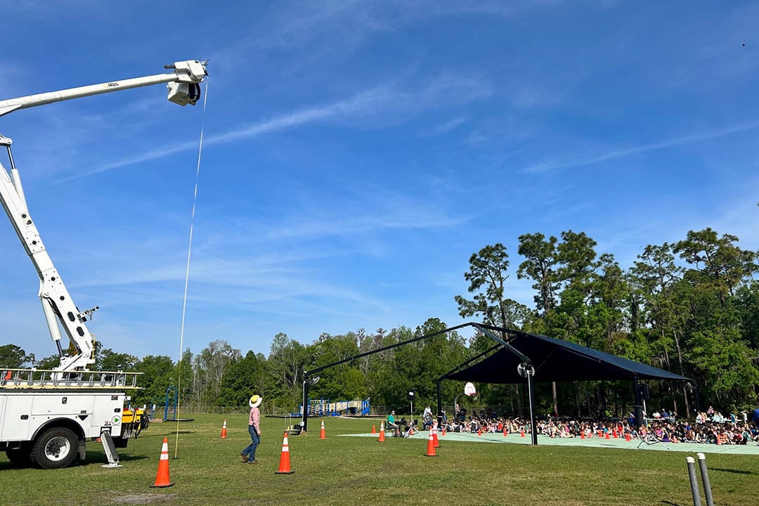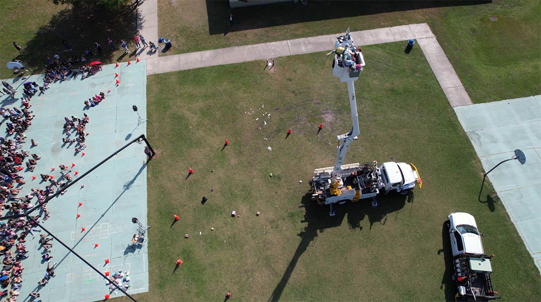 The twist? Well, that’s where Tampa Electric comes in. Abby contacted us to see if we were game to bring this challenge to greater heights. Fifty-five feet to be exact. That’s the highest-level Eastern Service Area Lineworker Justin Pettys and Apprentice Dalton Katrein raised the bucket truck to launch 115 egg containers created by kindergarteners through fifth graders.