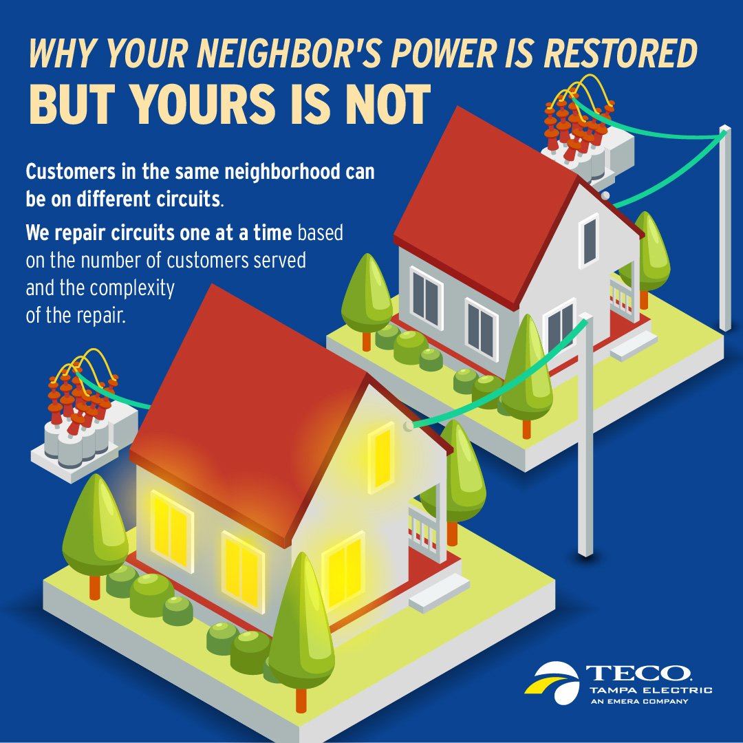 A. All customers are important and equal to Tampa Electric. Our recovery strategy is to restore power to the largest number of customers in the shortest amount of time. If you wonder why a neighbor or nearby neighborhood has power but you don’t, it’s likely because your neighbor is powered by a different circuit/feeder line.