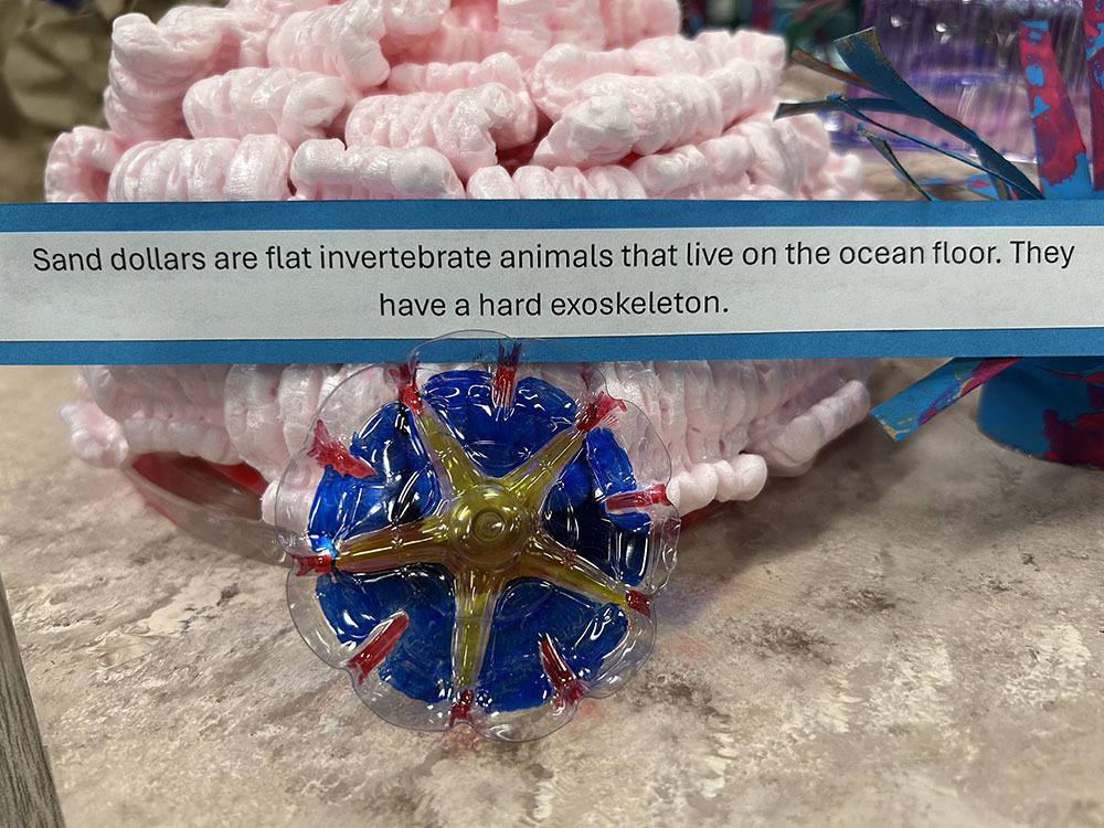 All their efforts culminated in a vibrant coral reef art installation in the school’s media center. The reef (pictured below) is made entirely from reclaimed materials to visually communicate a vital message: we can protect our oceans by rethinking how we use and dispose of plastics.