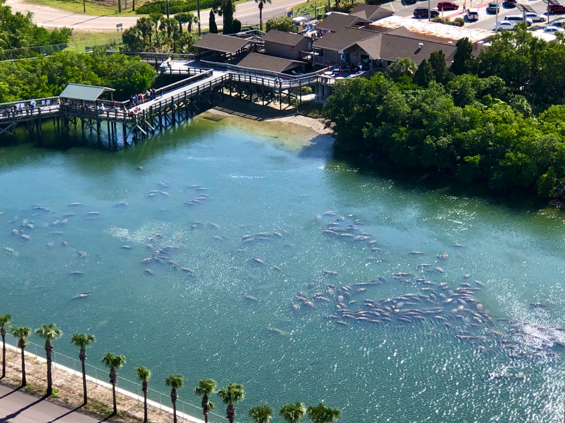 Manatees gather in droves to enjoy the warm water that surrounds the Manatee Viewing Center.
